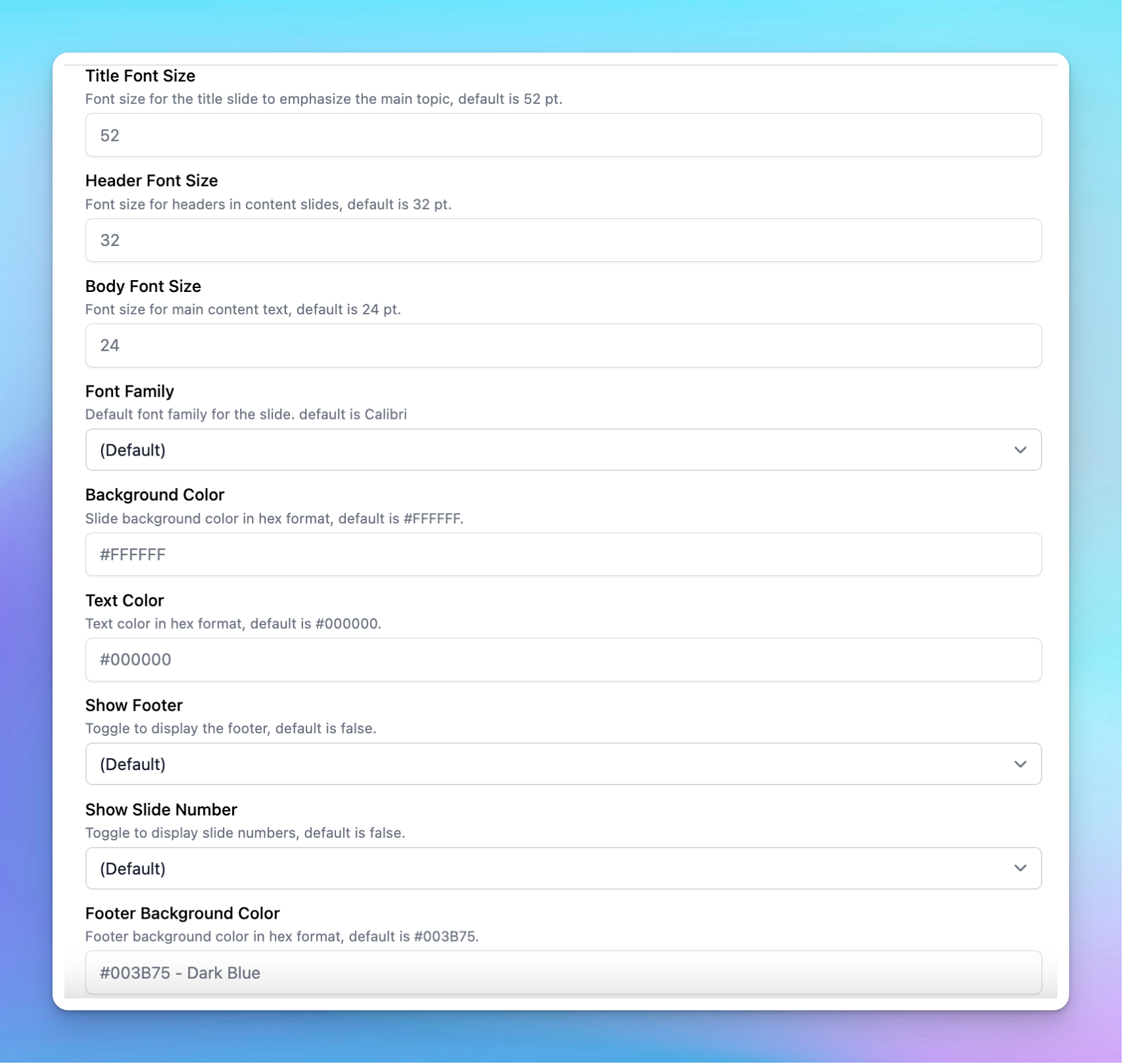 After setting up the Plugin server, you can customize how the slides will look by adjusting some settings such as Title font size, Header font size, Body font size, Font family, Background color, Text color, Show footer, etc.