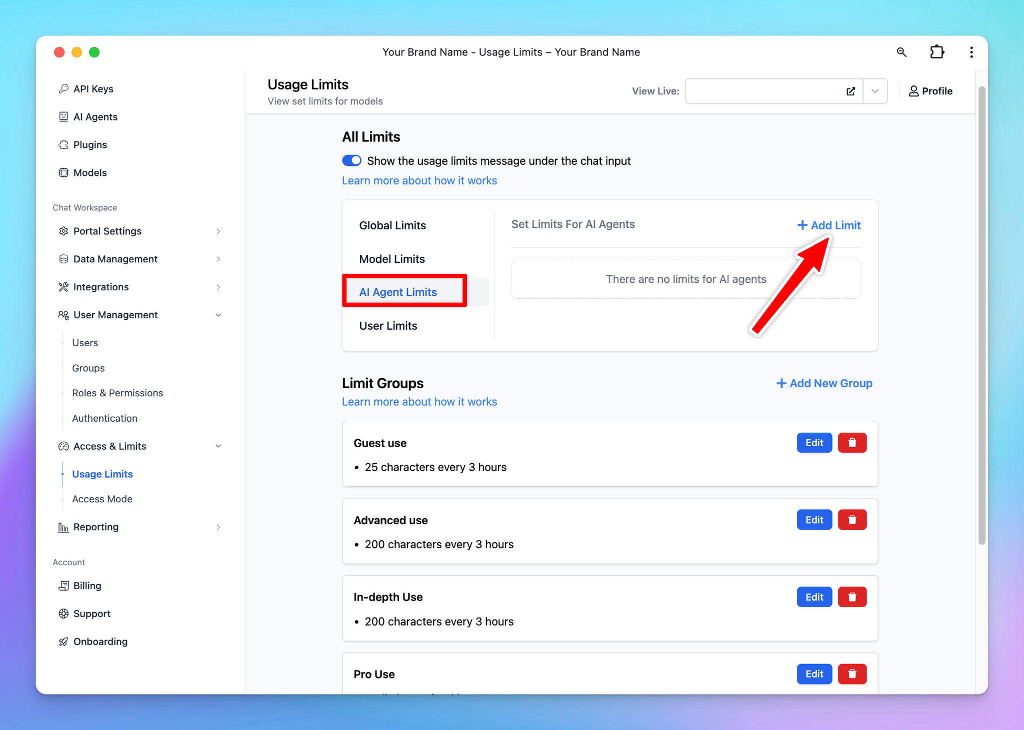 - Set up Usage limits: create a new limit group or select from existing limit groups to manage messages and characters users can send while using the AI Agent.